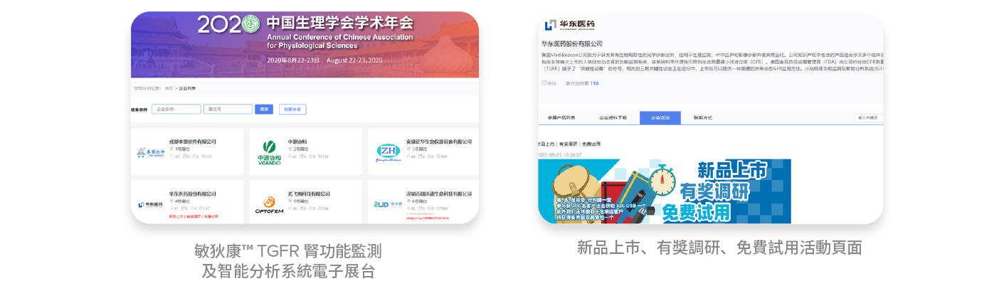 華東醫藥-MediBeacon聯合推廣的敏狄康™TGFR腎功能監測及智能分析系統作爲本次年會贊助商之壹,以電子展台的形式積極參與線上交流、展示和介紹産品,並與參會代表進行了互動,在廣大生理學工作者中留下深刻印象。華東醫藥- MediBeacon聯合推廣的敏狄康™TGFR腎功能監測及智能分析系統在國內首次上市,以新品上市、有獎調研、免費試用的活動,吸引了多位參會者的關注,累計有144位參會人員對電子展台進行了詳細信息的浏覽閱讀 ,完成線上調研問卷17份,提升了國內生理學工作者對動物腎功能GFR測量的廣泛認識,提升了敏狄康品牌的認知度。 華東醫藥-MediBeacon聯合推廣的敏狄康™TGFR腎功能監測及智能分析系統在本次生理學年會中首次亮相,受到了廣大生理學工作者的廣泛認可,精准定位客戶的同時也促進了敏狄康™TGFR腎功能監測及智能分析系統與學術工作者之間的相互的學術交流與合作。